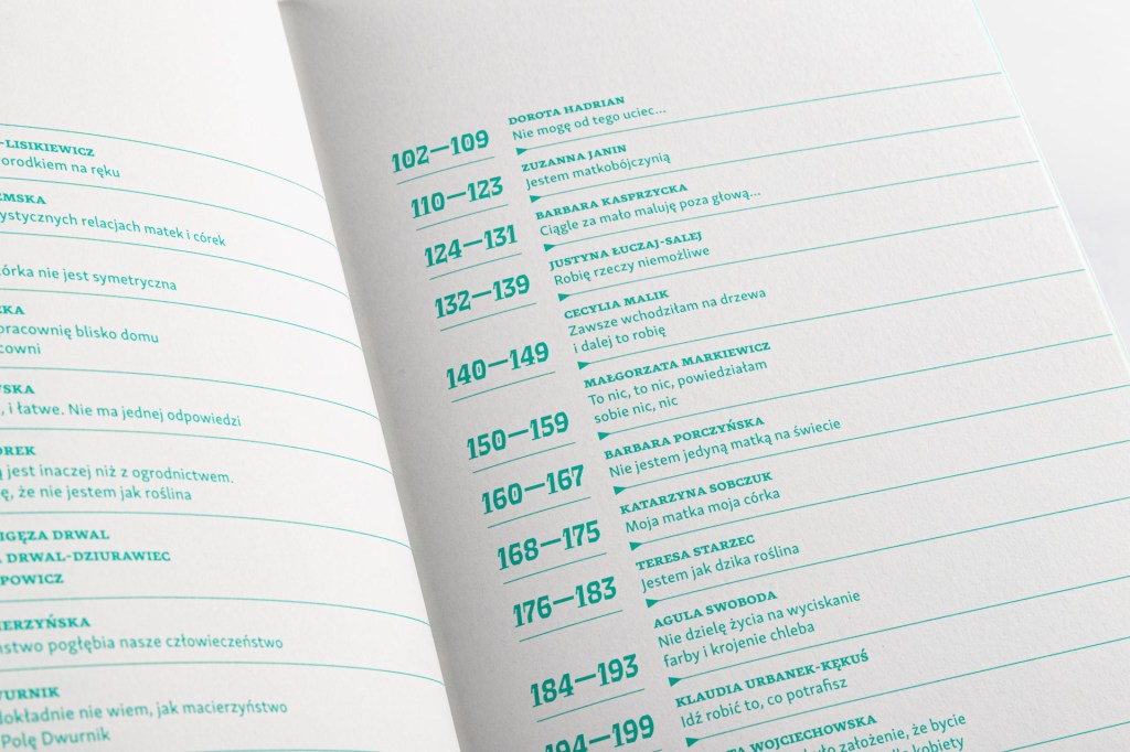 rozmowy z artystkami: Bettina Bereś, Dorota Bernacka, Alicja Bielawska, Dominika Borek, Agnieszka Drwal-Dziurawiec, Pola Dwurnik, Teresa Gierzyńska, Aneta Grzeszykowska, Dorota Hadrian, Zuzanna Janin, Zofia Karpowicz, Barbara Kasprzycka, Bogdana Ligęza-Drwal, Justyna Łuczaj-Salej, Cecylia Malik, Małgorzata Markiewicz, Barbara Porczyńska, Katarzyna Sobczuk, Teresa Starzec, Agula Swoboda, Klaudia Urbanek-Kękuś, Marta Wojciechowska