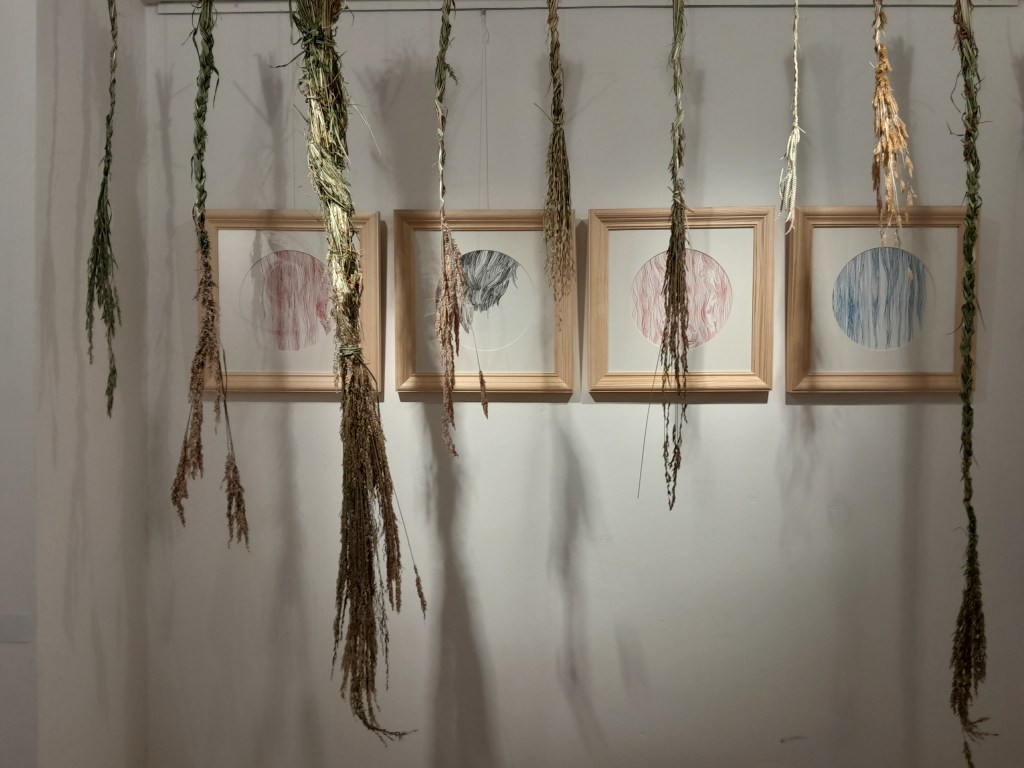 Instalacja, trawy, rysunki tuszem na papierze. 210 x 120 cm